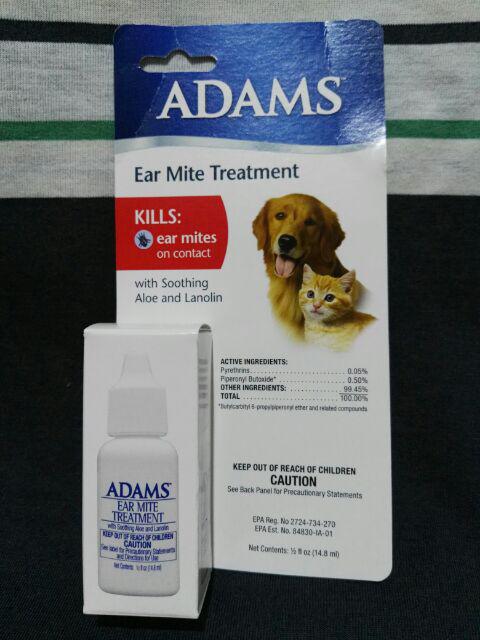 Adams ear mite treatment. Kills ear mites on contact Contains aloe to help soothe irritated skin Offers relief for cats and dogs suffering from ear mites Easy-to-use applicator tube Use on cats and dogs 12 weeks or older. These instructions say 5 drops in each ear a day for 7-10 days. 4 filas Adams Ear Mite Treatment offers relief for dogs and cats suffering from ear mites.
