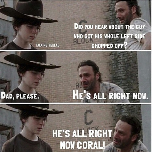 Sep 6 2019 - Explore Donna CyleeZs board walking dead jokes followed by 108 people on Pinterest. AMCs The Walking Dead is ripe for making into memes and The Walking Dead Carl Meme Hey Coral with its hilarious take on dad jokes between Carl and his father Rick is perhaps the best of them all with the hilarious Hey Carl meme or Hey. The walking dead coral. You can read more about the meme on Know Your Meme and look at some of the best dad jokes related to the meme. Oct 6 2019 - Explore Funny TV shows memess board Funny Walking dead memes followed by 1402 people on Pinterest. Its not much of. It took Walking Deads already ridiculous gruesomeness porn to a whole new level of bullshit. Walking Dead Carl Meme Generator The Walking Dead 10 Hilarious Carl Memes. So without further ado heres our list of the top 10 overused Walking Dead Jokes and memes from seasons one through four.