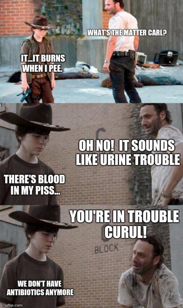 Walking dead joke meme. Rick and Carl 3. See more ideas about walking dead funny walking dead jokes. The neighbor was grocery shopping the relative was on vacation and the coworker was home watching The Walking Dead.