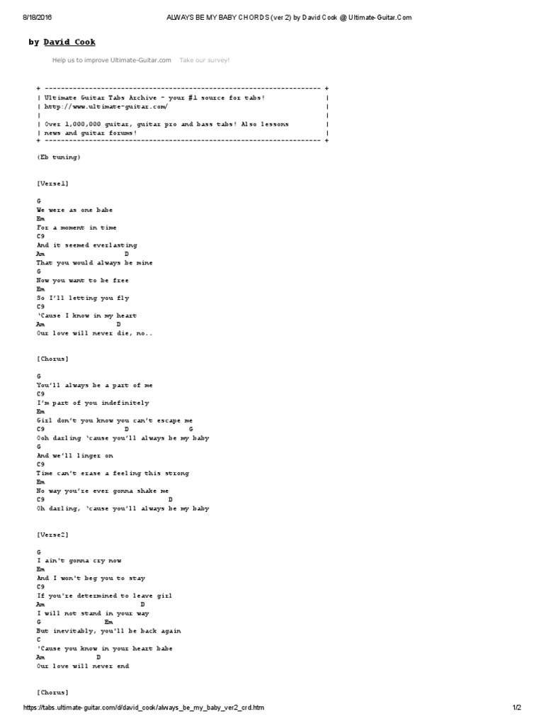 Piano bass and guitar Always Be My Baby ver 5 Chords Mariah Carey chords tabs and lyrics. Chord David Cook - Always Be My Baby. Learn to play guitar by chord tabs using chord diagrams transpose the key watch video lessons and much more.